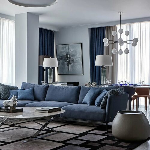 Синий и серый - это идеальная комбинация цветов для создания стильного и современного интерьера. Синий цвет придает гостиной ощущение спокойствия и гармонии, а серый добавляет нотку элегантности. Вы можете выбрать разные оттенки синего и серого, чтобы создать интересный контраст или использовать их в одной цветовой гамме для более сдержанного и гармоничного вида.