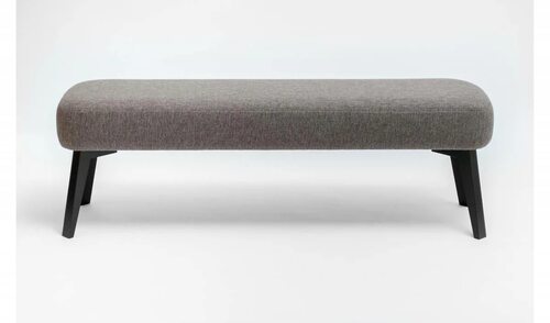 - Белая банкетка с прямыми линиями и металлическими ножками. - Банкетка с геометрическим узором на обивке и мягкими изогнутыми формами. - Черная банкетка с квадратными сиденьями и металлическими деталями.