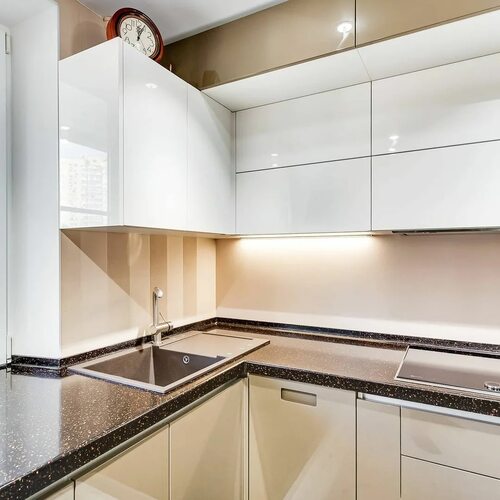 Глянцевые белые фасады и простые линии создают элегантный и современный вид. Этот стиль идеально подходит для небольших кухонь, так как визуально расширяет пространство.