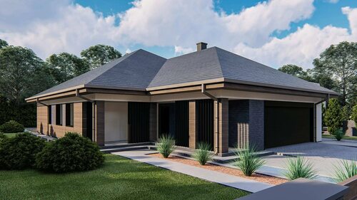 Этот проект представляет собой современный дом с вальмовой крышей, выполненной из металла. Благодаря своей форме и материалам, дом выглядит современно и стильно. Внутри вы найдете просторные помещения с большими окнами, позволяющими насладиться красивыми видами на окружающую природу.