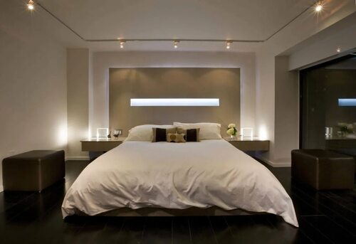 Если вы предпочитаете минималистичный и сдержанный стиль, то встроенное освещение будет отличным выбором. Установите светодиодные ленты или точечные светильники в нишах над кроватью, чтобы создать эффектное и равномерное освещение.