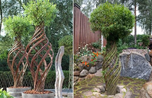 Ива плетеная Живая может быть плетена в различные орнаментальные формы, такие как спирали, кольца или дуги. На фото видно, как такие формы добавляют интерес и эстетическую привлекательность в садовом пространстве.