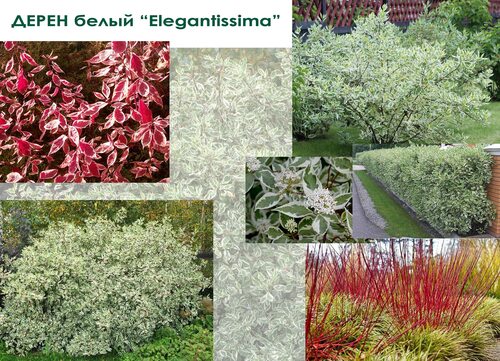 Кустарник достигает высоты до 2,5 метра и имеет раскидистую крону. Листья Дерена Элегантиссима имеют белые края, создавая эффектный контраст с зеленым центром. Это придает растению особый шарм и делает его привлекательным даже вне сезона цветения.
