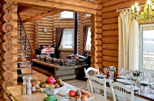 Основной принцип при оформлении интерьера в бревенчатом доме - использование натуральных материалов. Дерево должно быть в центре внимания, поэтому стены и потолки лучше оставить ненакрашенными или подчеркнуть естественную текстуру и цвет.