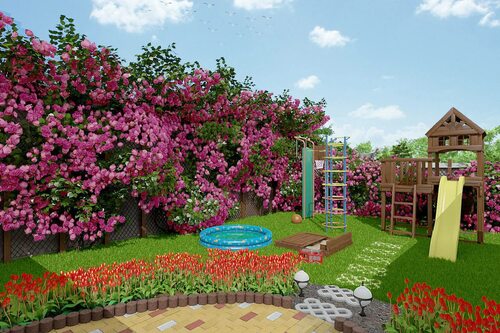 В данном варианте Розарий имеет вид цветочных аллей, соединяющих различные участки. Вы можете прогуляться по аллеям, наслаждаясь разнообразием розовых оттенков.