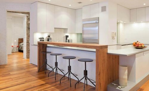 Фото 2: Кухонная барная стойка, размещенная на кухонном острове.