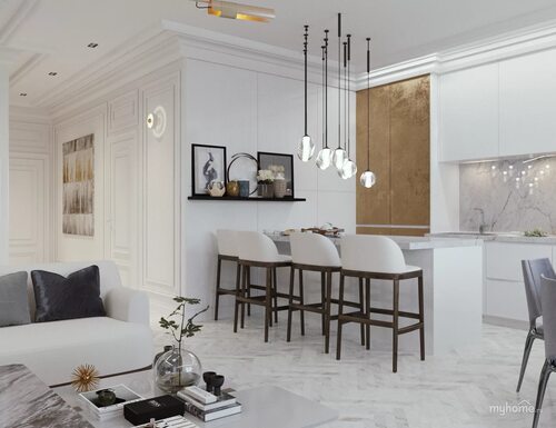 2. Распределение света. Люстры в стиле Неоклассика обычно имеют несколько источников света, что позволяет равномерно осветить всю кухню. Вы сможете создать комфортное и функциональное освещение, которое подойдет для приготовления пищи, обедов с семьей и вечерних посиделок.