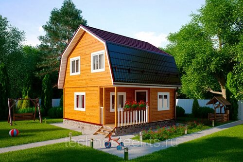 Наш дачный домик имеет традиционную деревянную архитектуру, что позволяет ему органично вписываться в окружающий ландшафт. Фасад дома отделан натуральным камнем, добавляющим ему шарм и изысканность.