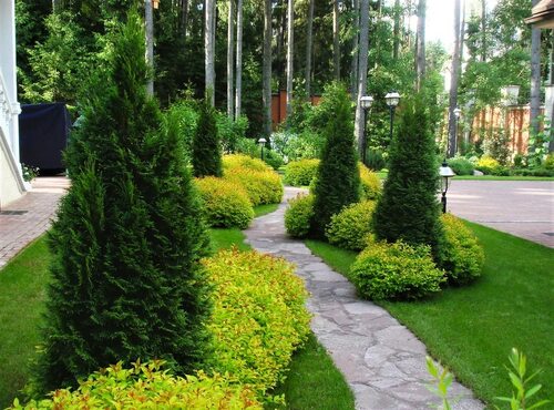 Хвойные растения могут иметь разные оттенки зеленого, а также отличаются цветом хвои, что добавляет разнообразие и глубину в дизайн сада.