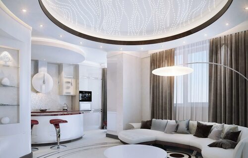 Полукруглая форма гостиной придает интерьеру необычный и нестандартный вид. Это отличное решение для тех, кто хочет выделиться и создать уникальное пространство в своем доме.