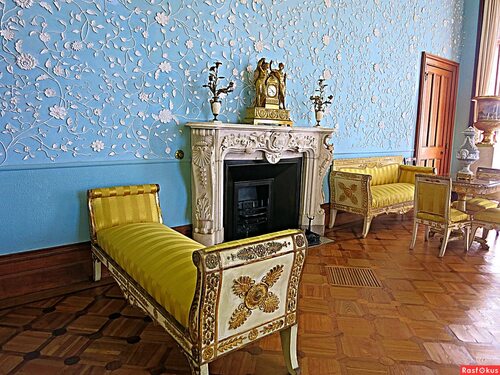 Голубая гостиная была создана в XIX веке архитектором Александром Брюлловым. Этот зал служил для приема гостей и проведения торжественных мероприятий. Он получил свое название благодаря голубой цветовой гамме, которая преобладает в интерьере.