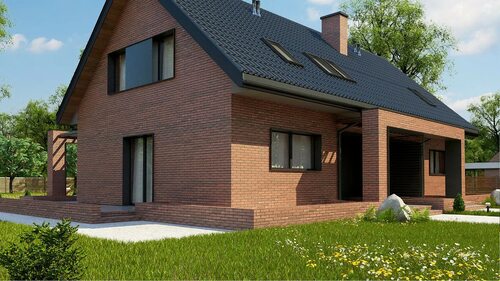 На этой фотографии представлен современный кирпичный дом с двускатной крышей. Фасад выполнен из текстурного кирпича, а большие окна обеспечивают прекрасный обзор на окружающую природу.